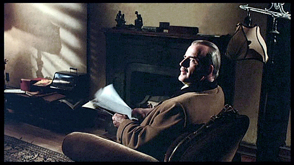 beleuchtet, in einem Sessel da und liest in dem Manuskript; wie eine